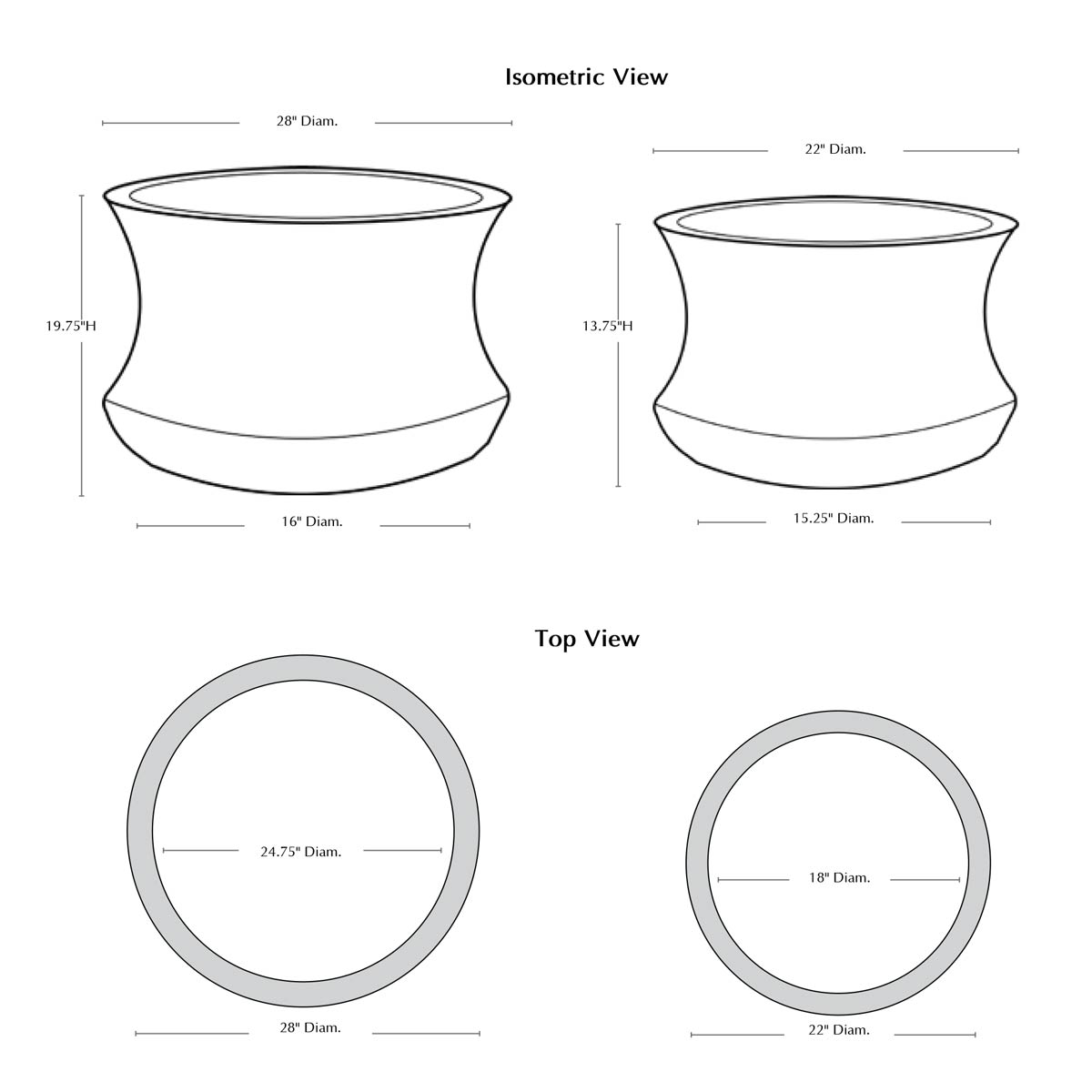| Size | Set of 2 28"DIA x 19.75"H | 144 lbs 22"DIA x 13.75"H | 61 lbs |