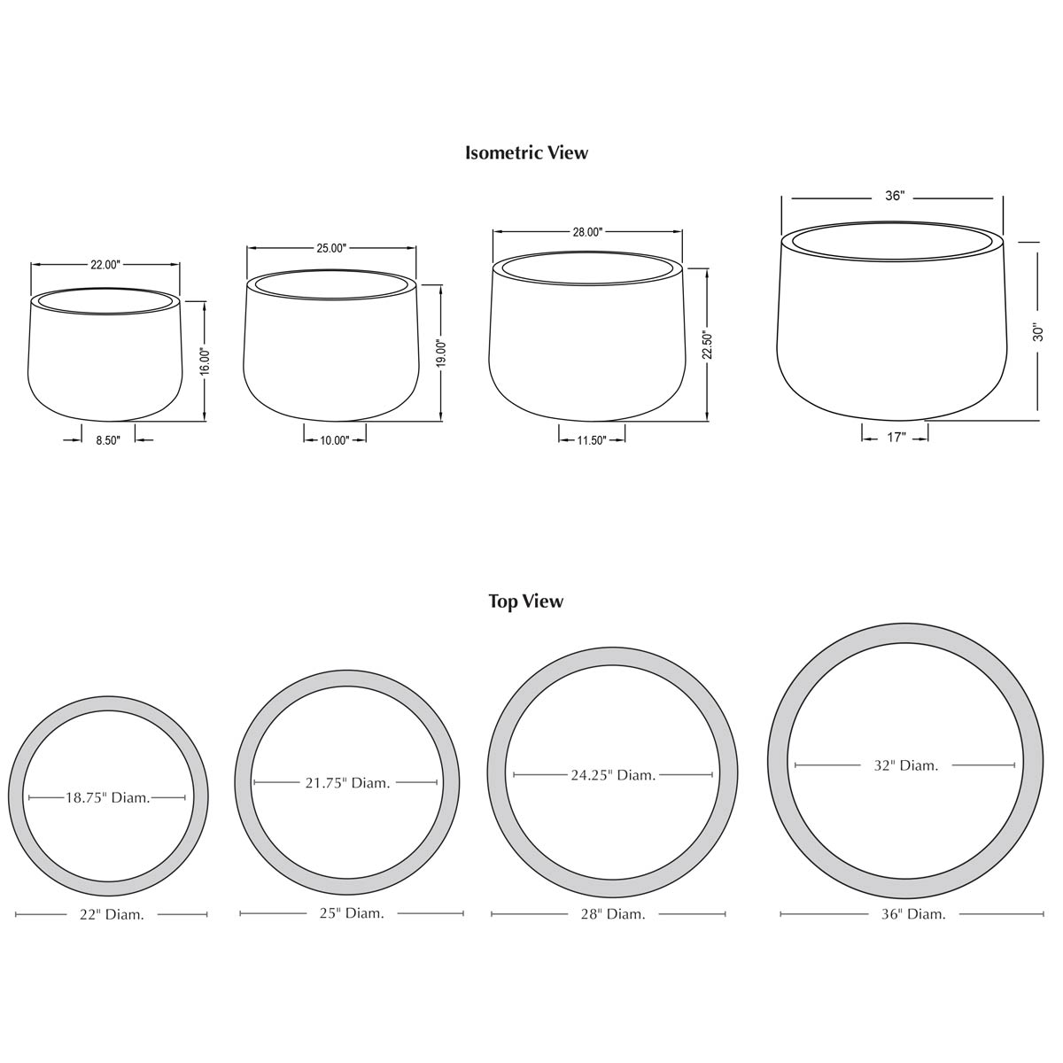 | Size | 22"DIA x 16"H | 140 lbs 25"DIA x 19"H | 208 lbs 28"DIA x 22.5"H | 306 lbs 36"DIA x 30"H | 606 lbs |