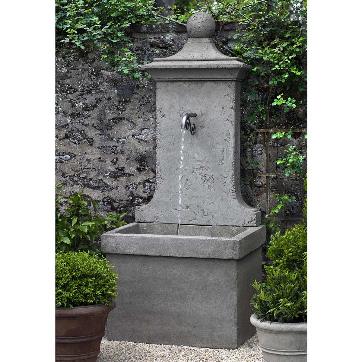The antique finish of the Vence Wall Fountain brings dimension and style to garden and patio fence lines. Featuring a clean, elegant design, this garden fountain has a single spout that pours water into a large rectangular basin below. It produces a calming sound and adds a lovely ambiance set among shrubs or planters.
