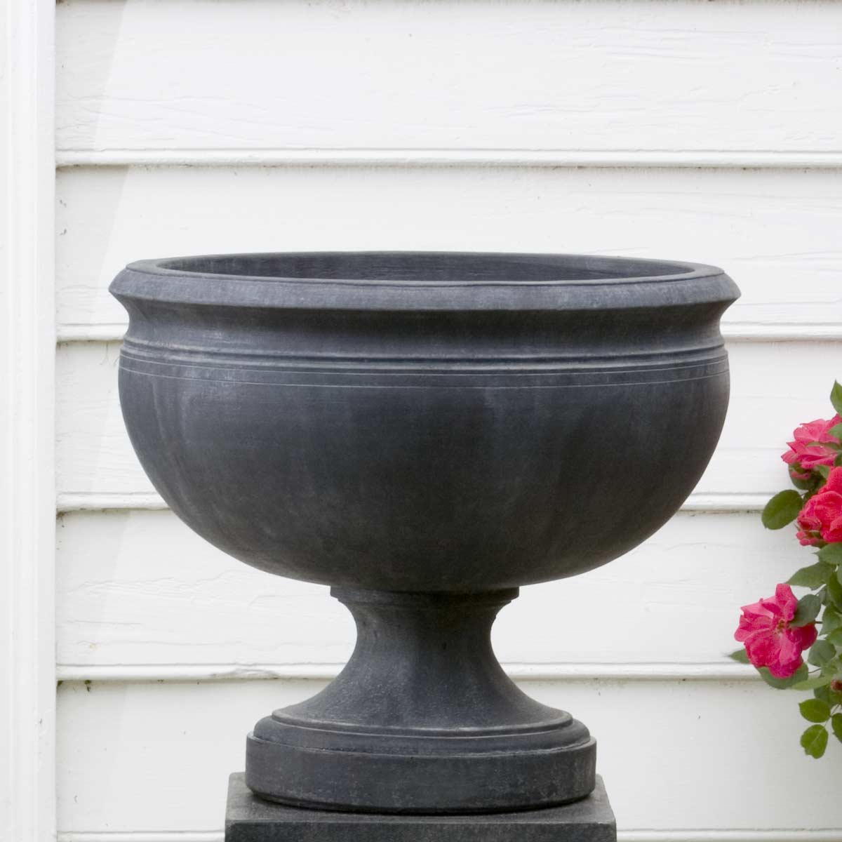 The Williamsburg Plantation Urn has an elegant chalice shape that calls for elevation on a pedestal plinth. It’s a great choice for heirloom roses or other traditional shrubs and is crafted from cast stone in a variety of finish options. Part of the Williamsburg collection, these pieces draw from 18th-century designs and offer a refined, yet contemporary, aesthetic.