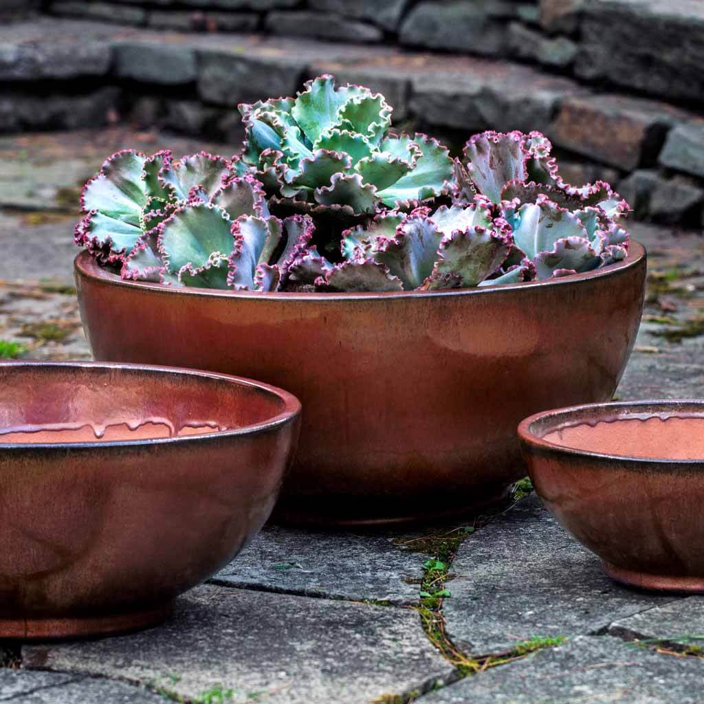 Inspired by the timeless appeal of Asian lacquerware, the three-piece Yuma Bowl set makes a striking focal point for your garden or patio. Crafted from terracotta with a high-gloss finish, these low planters in varying sizes provide an ideal base for shallow-rooting succulents or spreading foliage.